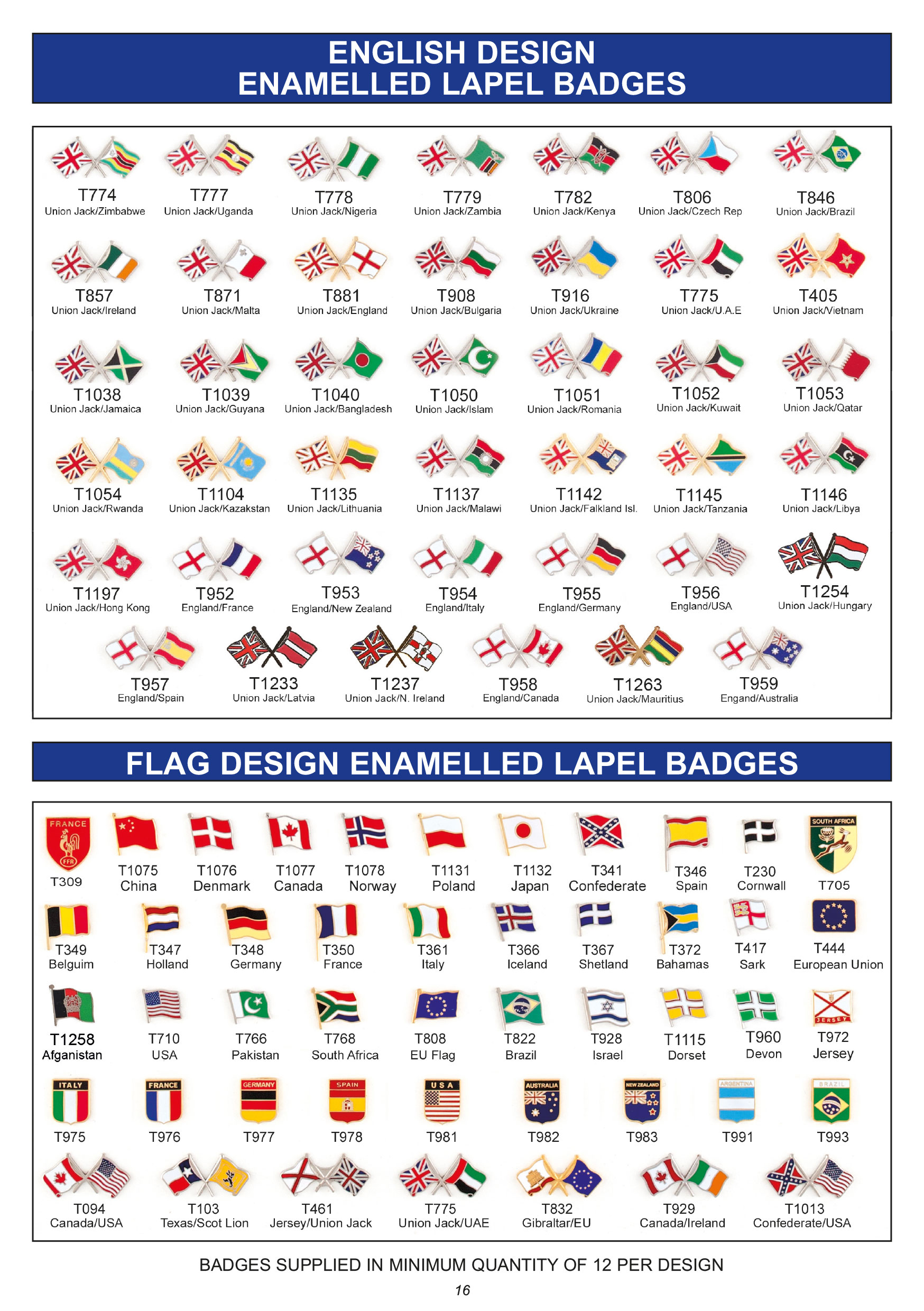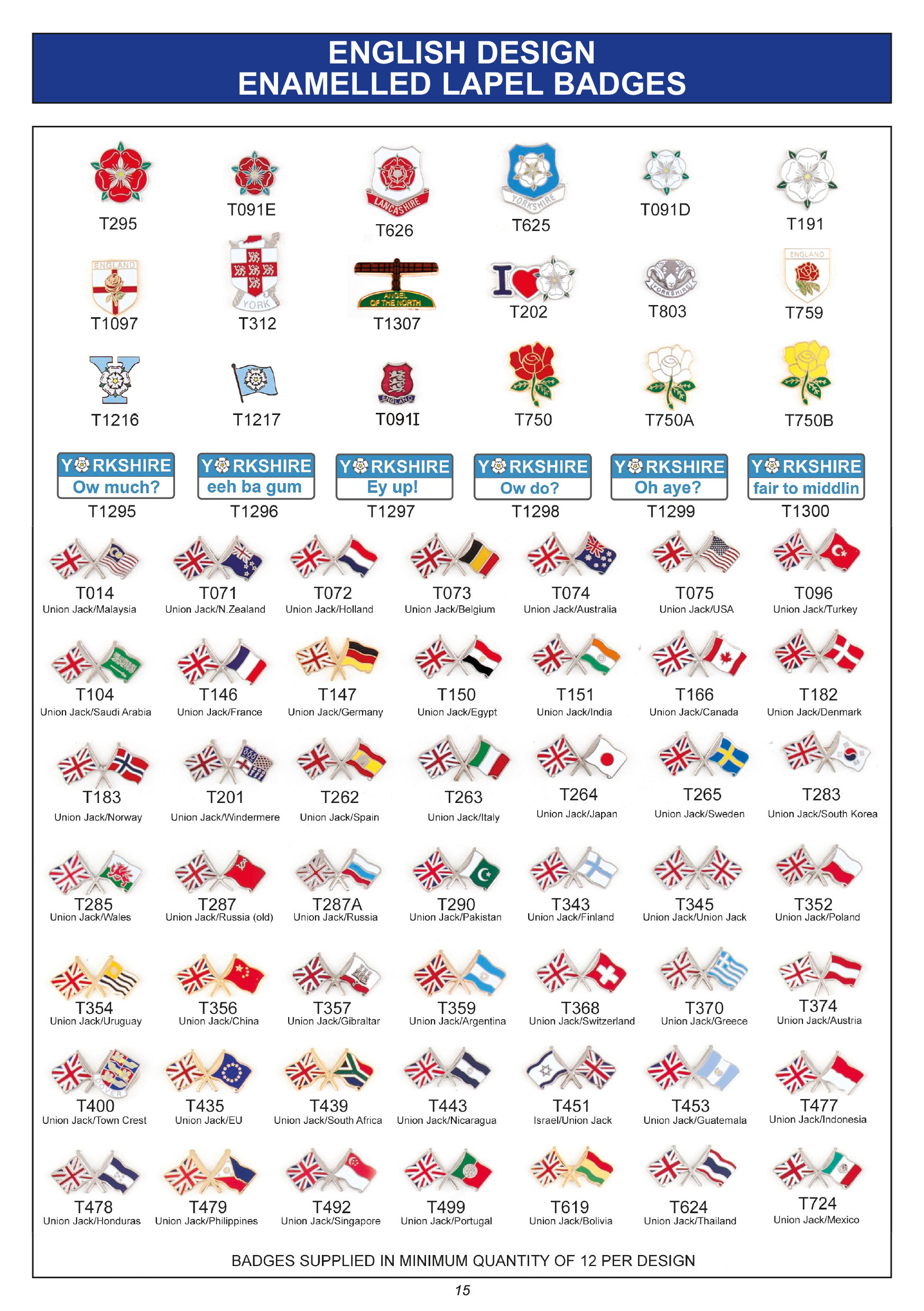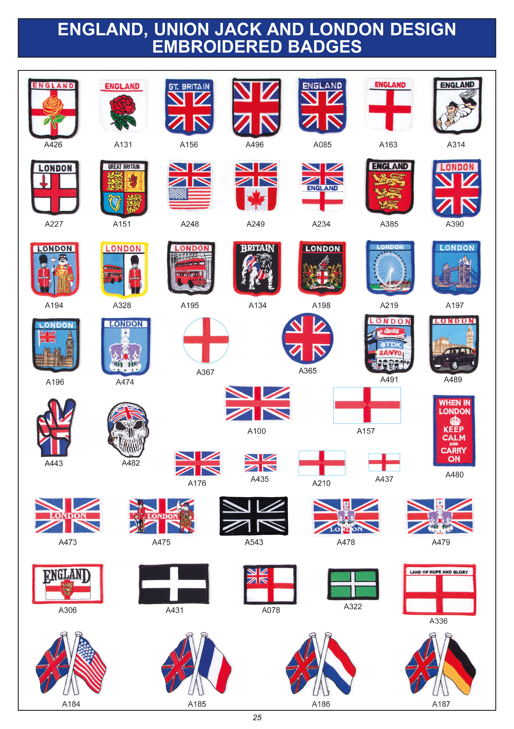 We offer a wide range of English and British themed Souvenirs. Our designs include Union Jack, St George’s Cross, English Rose together with numerous London themes, Yorkshire, Lancashire and more. We provide UK and England themed Lapel and Embroidered Badges as well as other souvenirs comprising Stickers, Collectors Spoons, Walking Stick badges, Silver Plated Thimble, Souvenir Flags, Keyrings, Key Fobs, Air Fresheners, Fridge Magnets and Bookmarks.