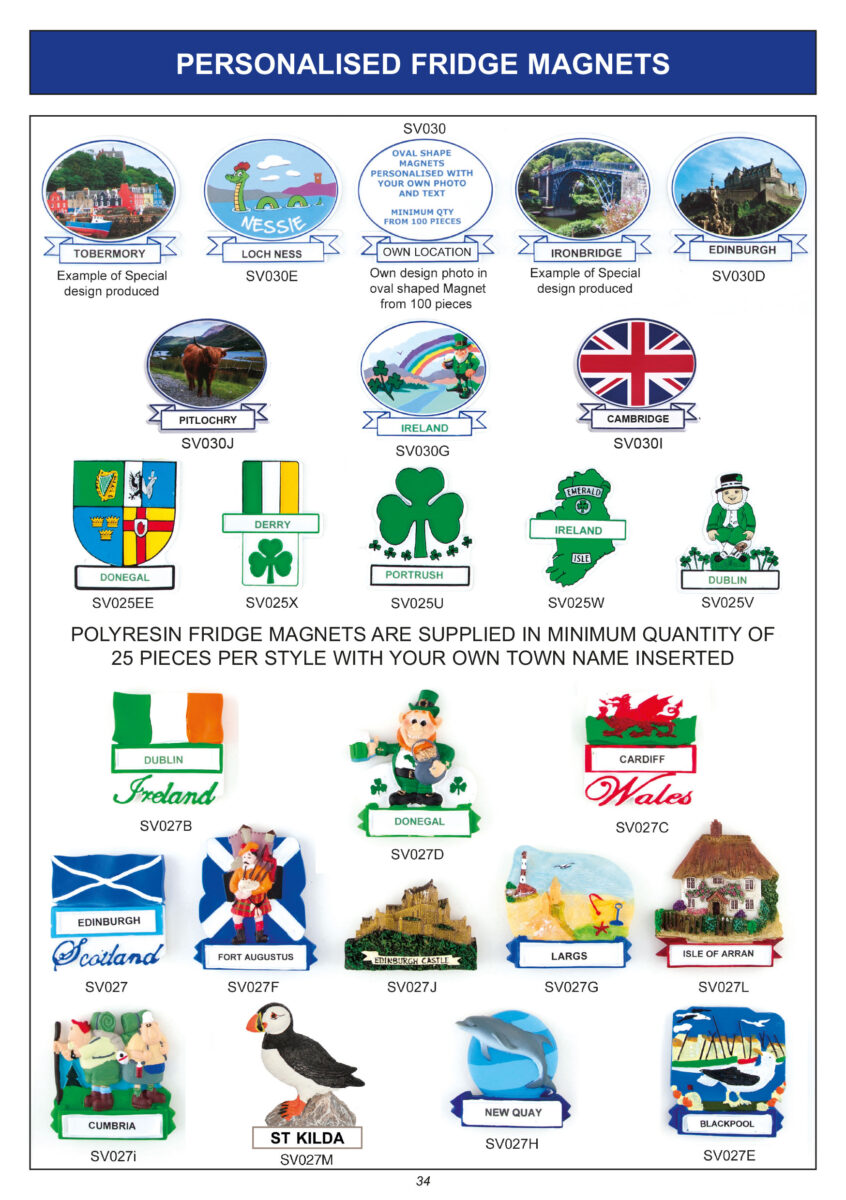Our Souvenir Fridge Magnets are isotropic ferrite rubber magnets which are supplied in a wide assortment of colourful stock designs allowing you to have the base sections named with your own Village, Town or location added in minimum order quantities as low as 25 pieces of any one design.