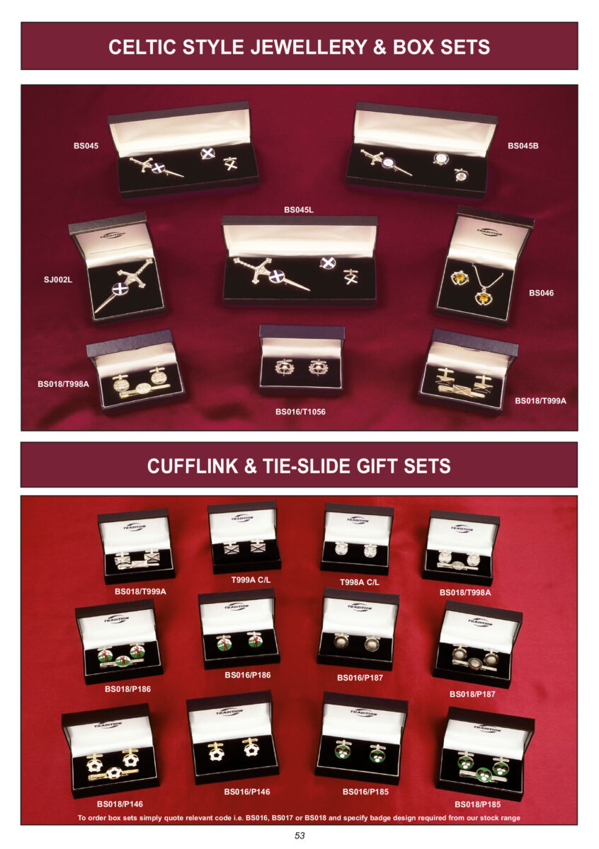 Our Gift and Box Sets make the perfect addition to any Gift or Souvenir store. We offer Celtic Jewellery sets, Cufflinks, Pen/gift sets, Hip Flask sets and more. These are available in a wide range of designs, from traditional Celtic and Scottish designs, to Club, Societies and Sports.